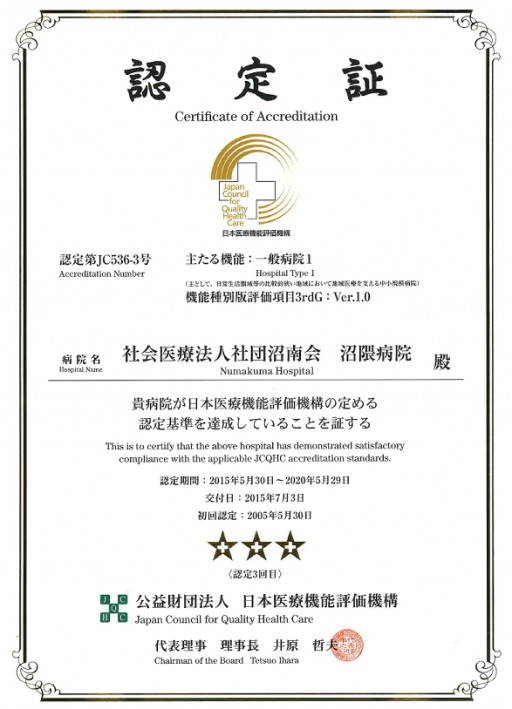 当院は3月12~13日に日本医療機能評価機構の訪問審査を受けて合格し、このたび認定証が交付されました。